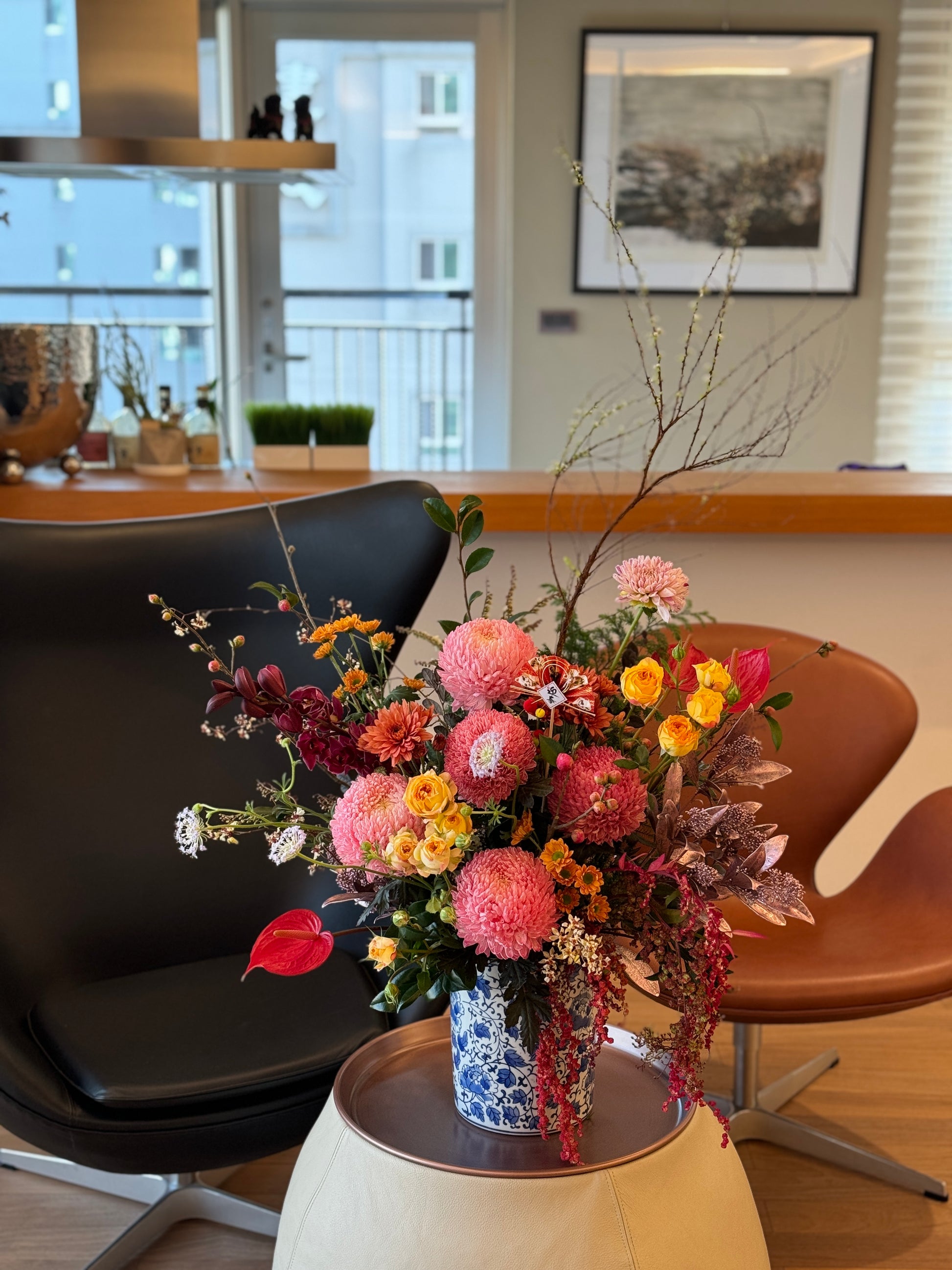 花材:粉牡丹菊,粉菊花,配花,葉材