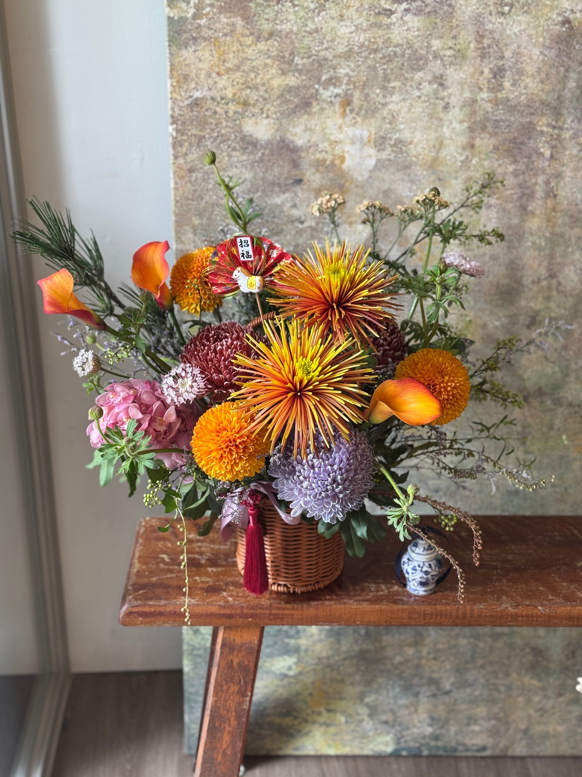 花材:牡丹菊,橘菊花,橘配花,葉材
